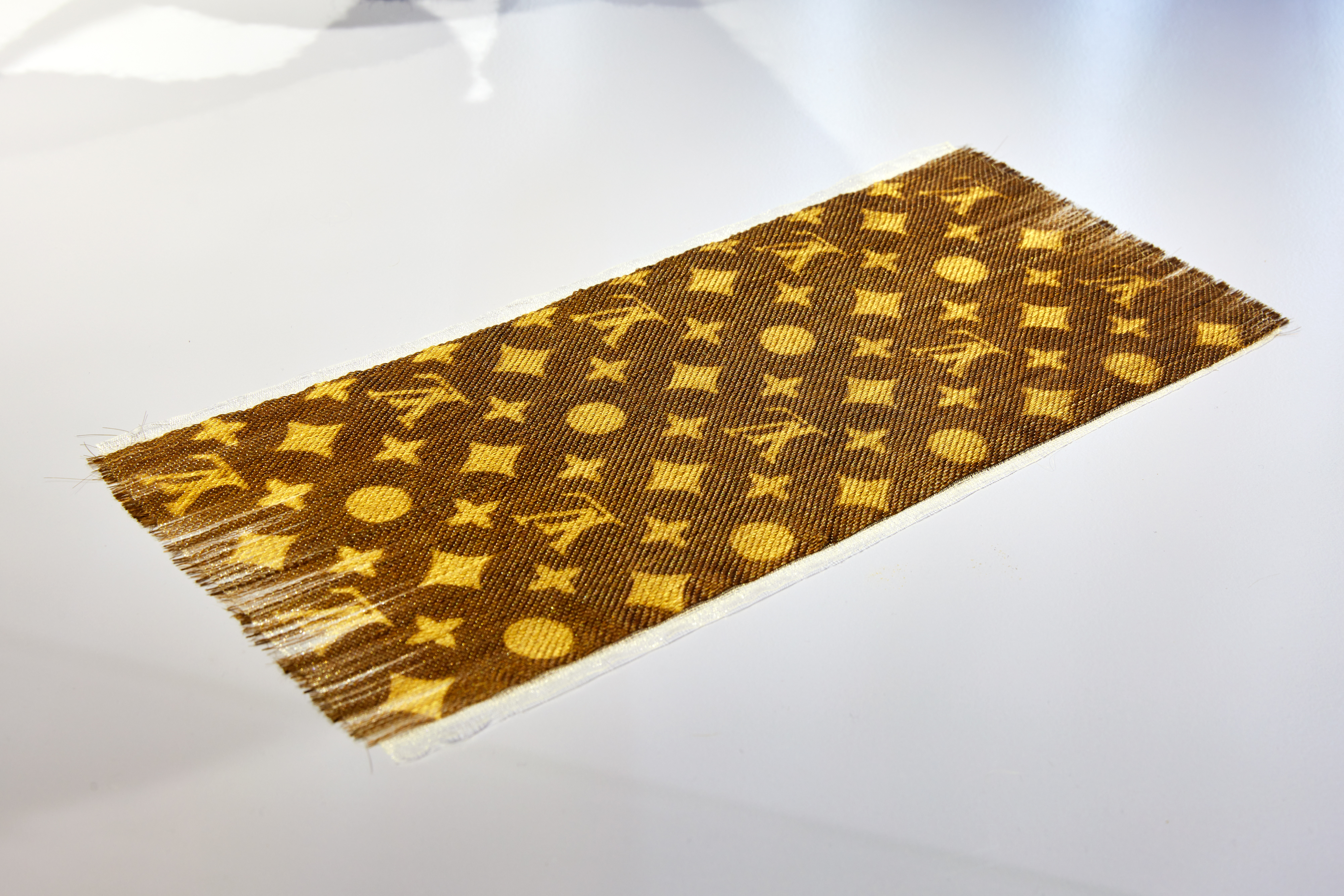 Hair yarn woven carpet, with monogram from fashion house Louis Vuitton; Antonin Mongin, France, 2018; hair, transparent nylon thread. Photo: Aad Hoogendoorn