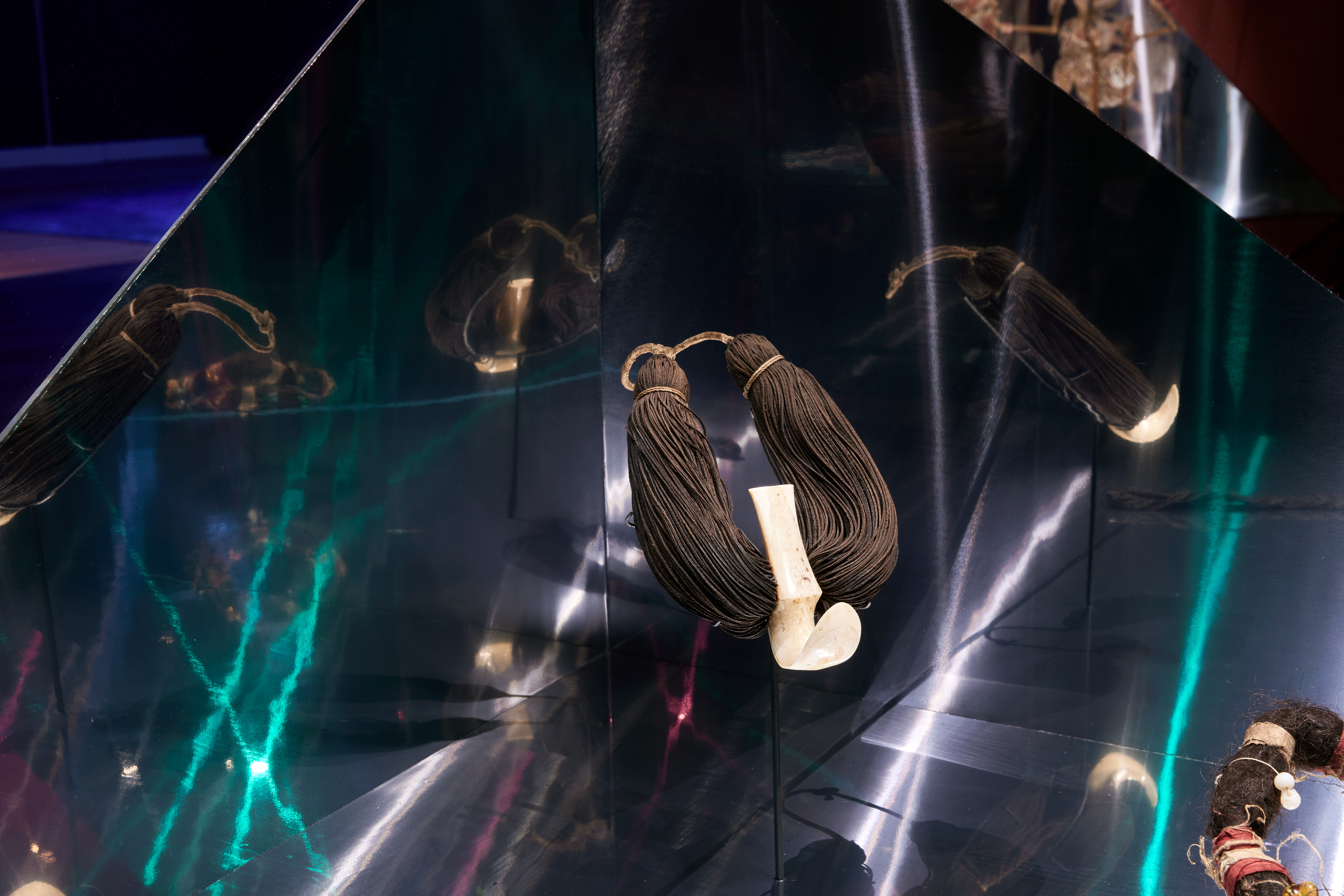 Ketting van walrustand die is vastgemaakt met talloze vlechten. In de 19e eeuw zou het door opperhoofden zijn gedragen. De vlechtjes werden gedoneerd door inwoners van de gemeenschap. Foto: Aad Hoogendoorn