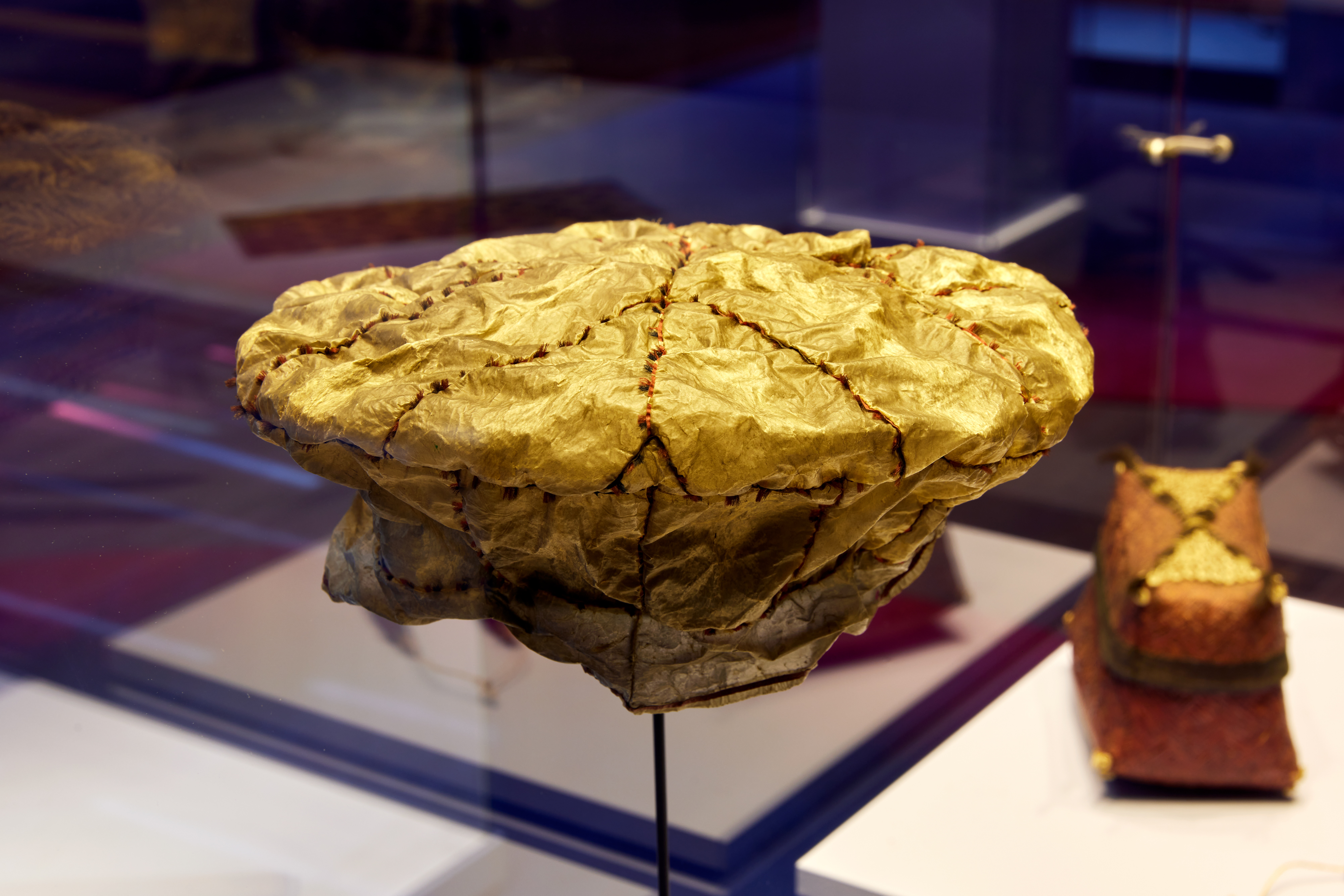 Regenmuts van ingewanden, waterdicht gemaakt met haar dat ingenaaid is in de naden; Alaska, 19ee eeuw; darm, haar (RV-331-5). Foto: Aad Hoogendoorn